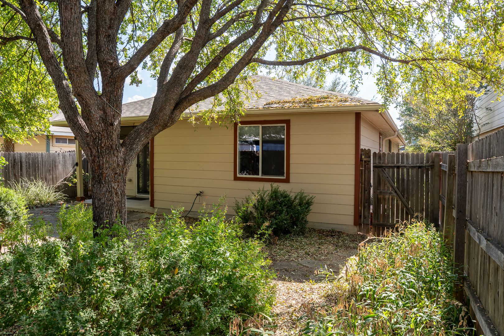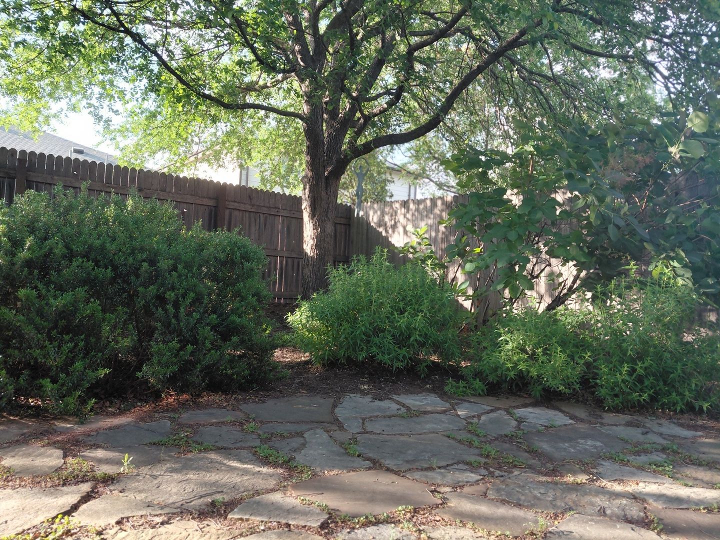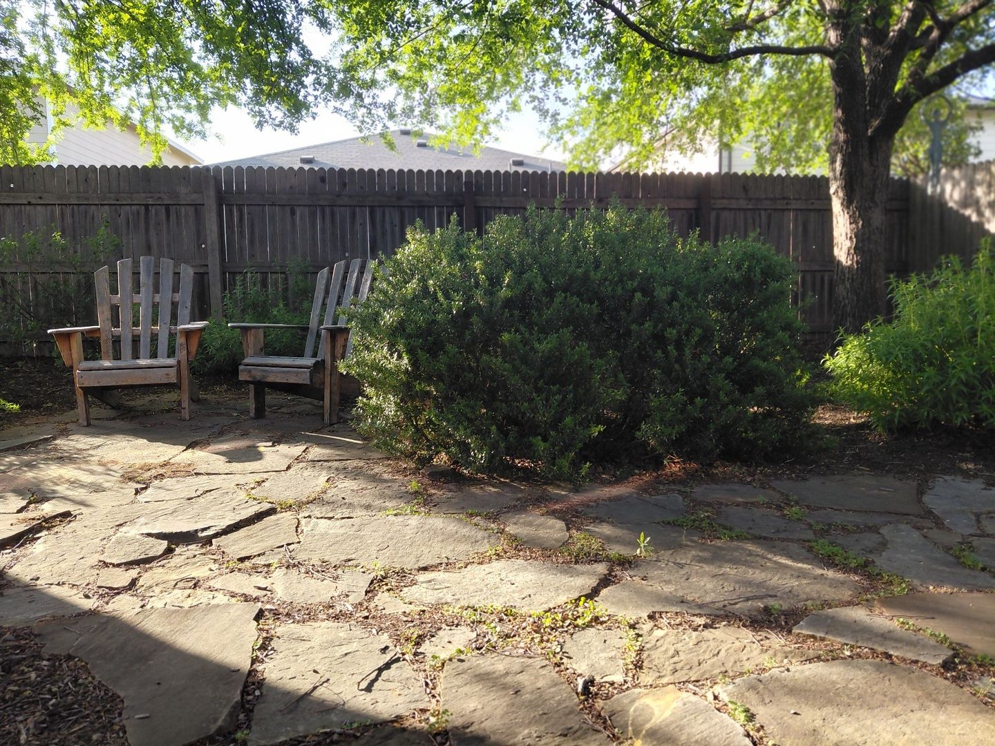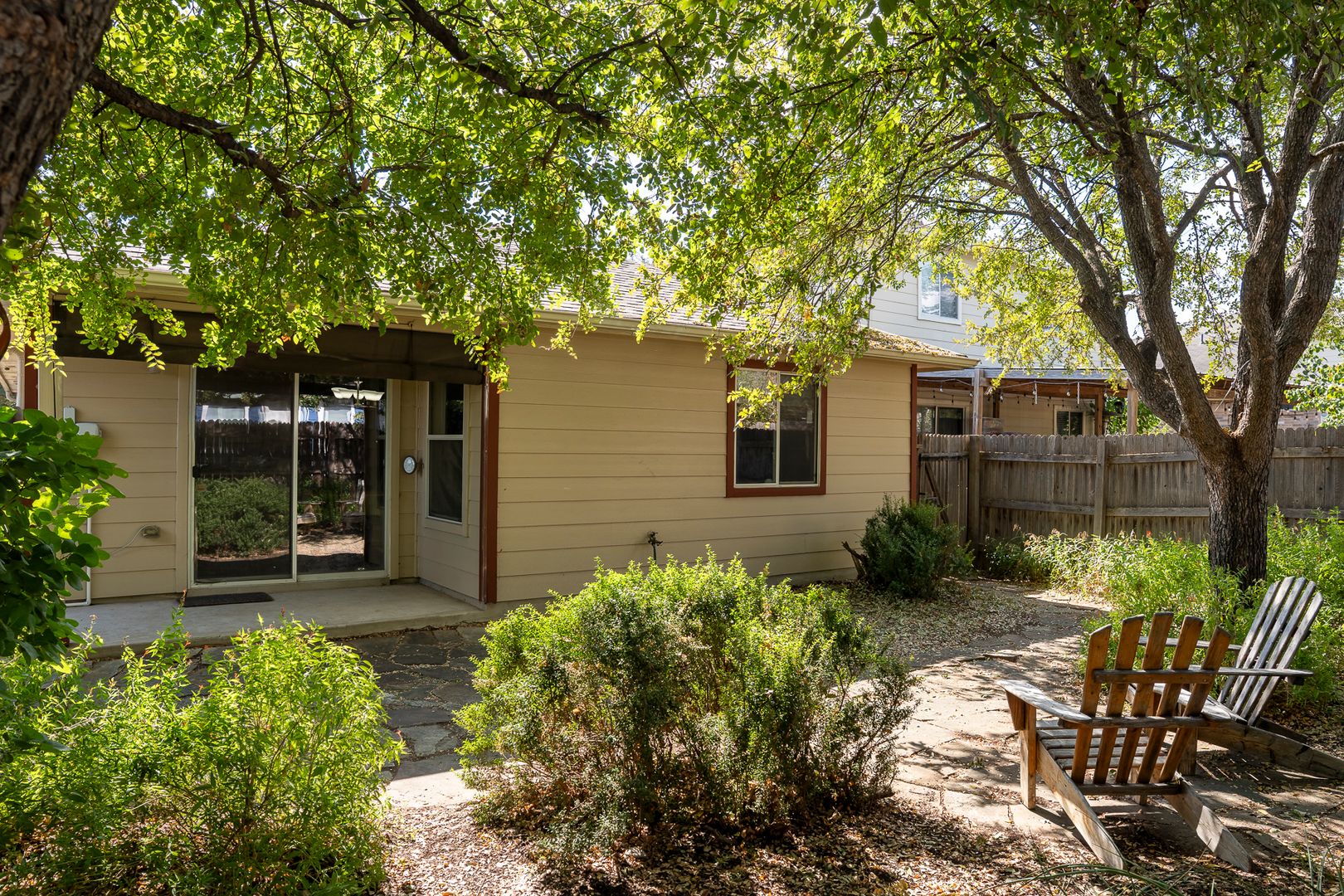 · Shaded backyard has 8-foot cedar fence, and Adirondack chairs