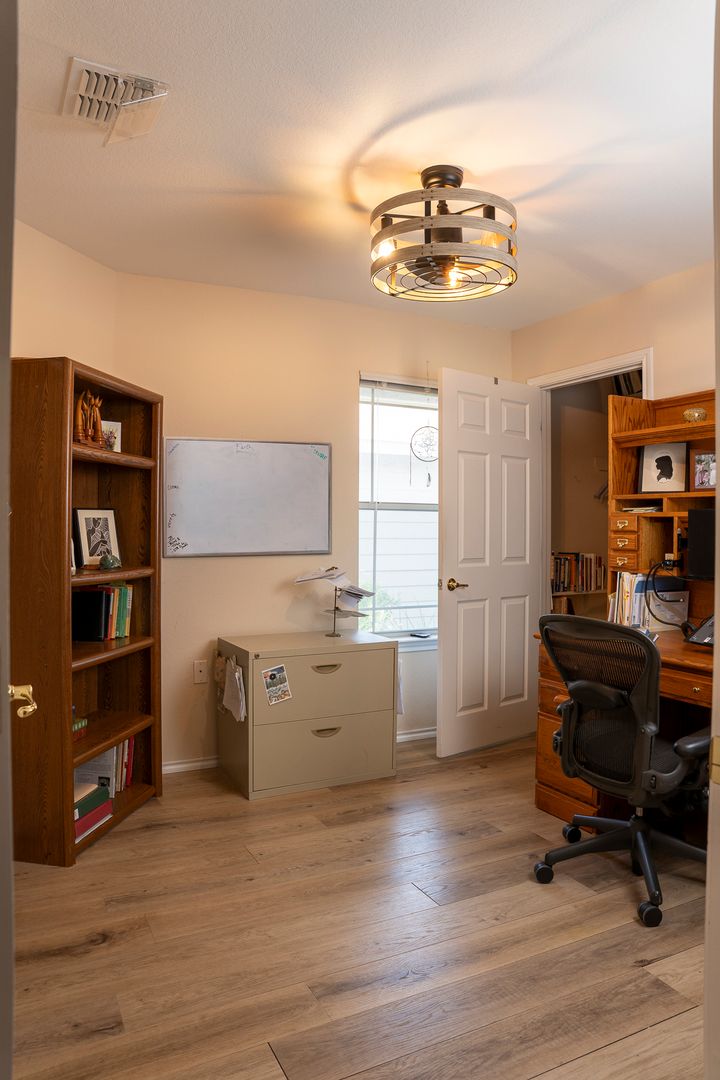 · 1 study with bookshelves, including in closet, and large wood desk with hutch, a printer cabinet, and three drawers